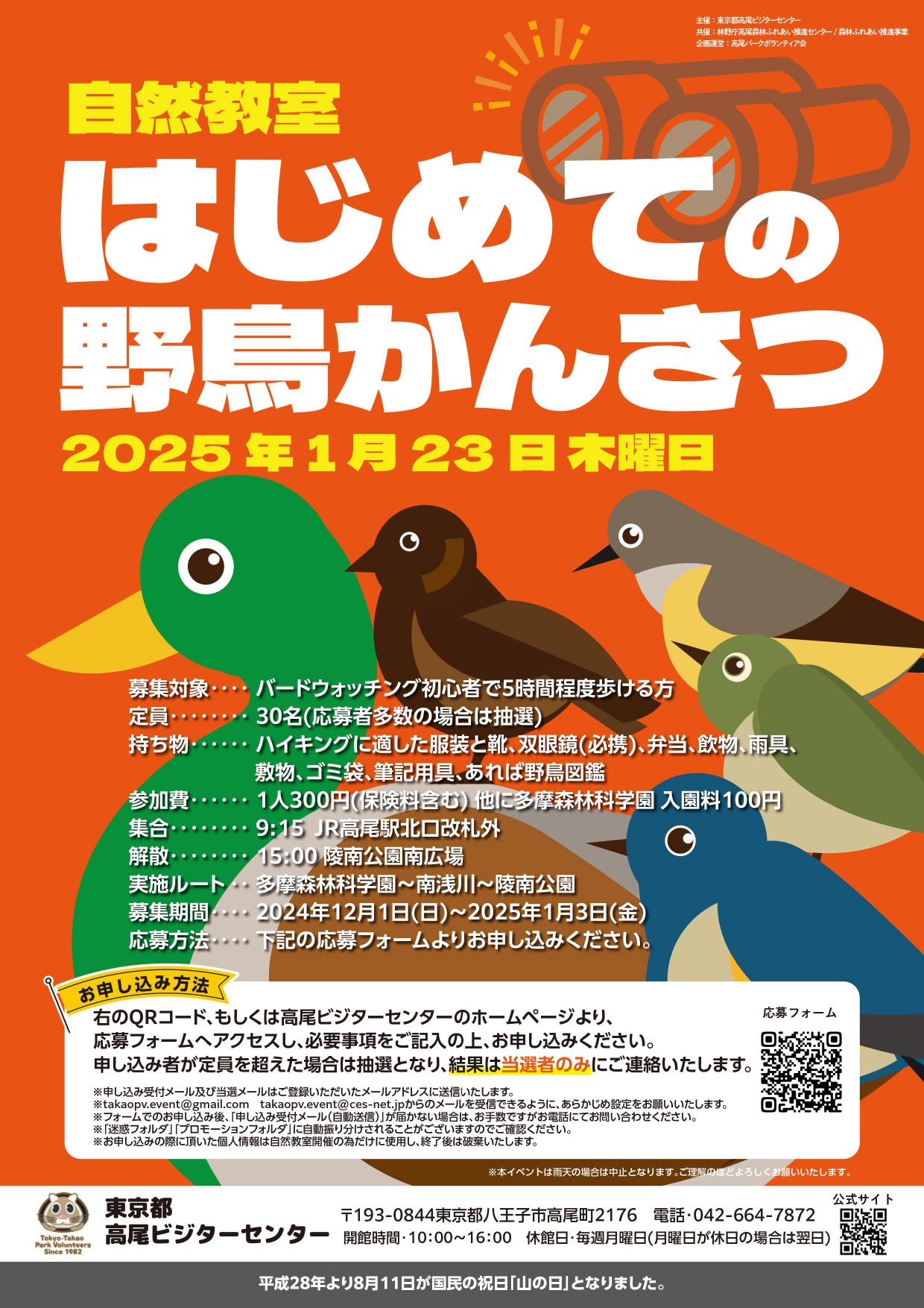 バードウォッチング初心者の方を対象に、野鳥観察しながら高尾周辺をハイキングします。