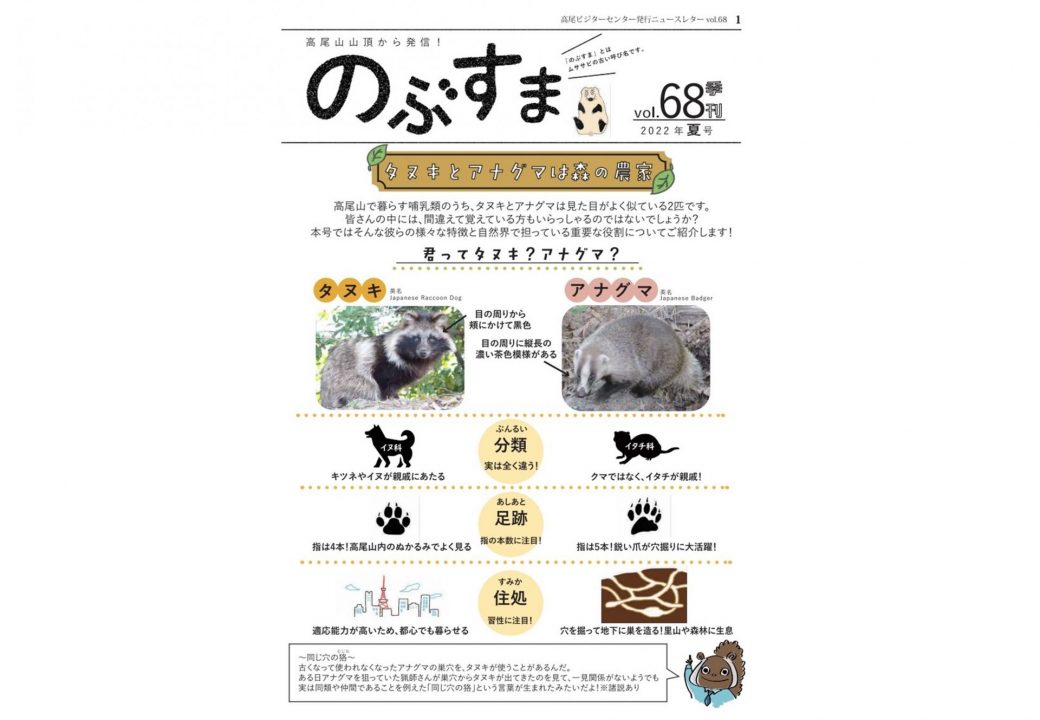 2022年7月9日 ニュースレターのぶすま最新号(vol.68夏号)を掲載しました ニュースレターのぶすま2022年夏号vol.68を掲載しました! 今回は「タヌキとアナグマは森の農家」です。 閲覧はこちらから。
