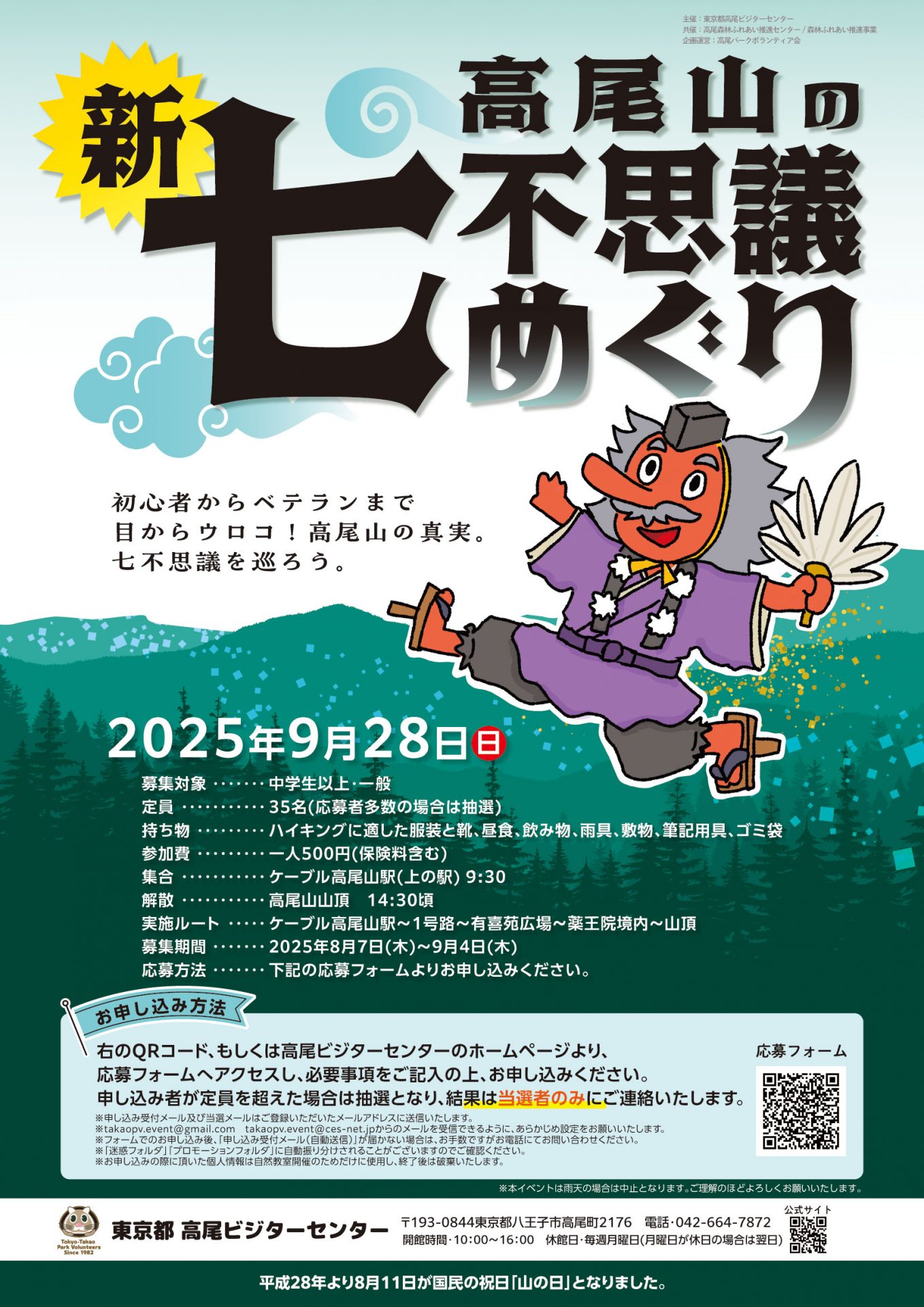 2025年8月7日 9月28日(日) 自然教室 「高尾山の新七不思議めぐり」募集開始 初心者からベテランまで目からウロコ! 高尾山中の七箇所を散歩しながら、高尾山の歴史や自然に関する真実を探ってみましょう。 募集期間:8月7日14:00~9月4日 詳細はこちらから