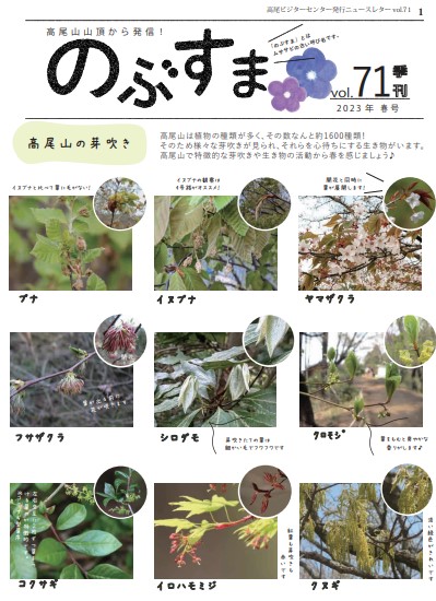 2023年4月20日 ニュースレターのぶすま最新号(vol.71春号)を掲載しました。 ニュースレターのぶすま2023年春号vol.71を掲載しました! 今回は「高尾山の芽吹き」特集です。 閲覧はこちらから。