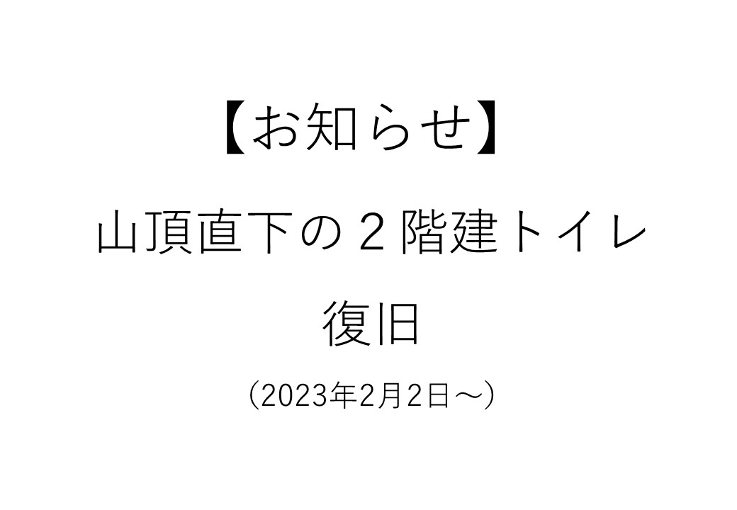 2023年2月2日 【お知らせ】山頂直下の2階建トイレ 復旧 2023年2月2日10:30~高尾山山頂直下の2階建トイレは機器の復旧が完了し、現在使用可能となっております。 ご不便をお掛けしまして、大変申し訳ありませんでした。