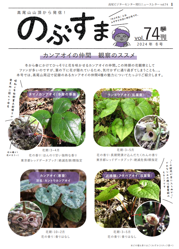 2024年1月8日 ニュースレターのぶすま最新号(vol.74号)を掲載しました。 ニュースレターのぶすま2024年冬号vol.74を掲載しました! 今回は「カンアオイの仲間」の特集です。 閲覧はこちらから