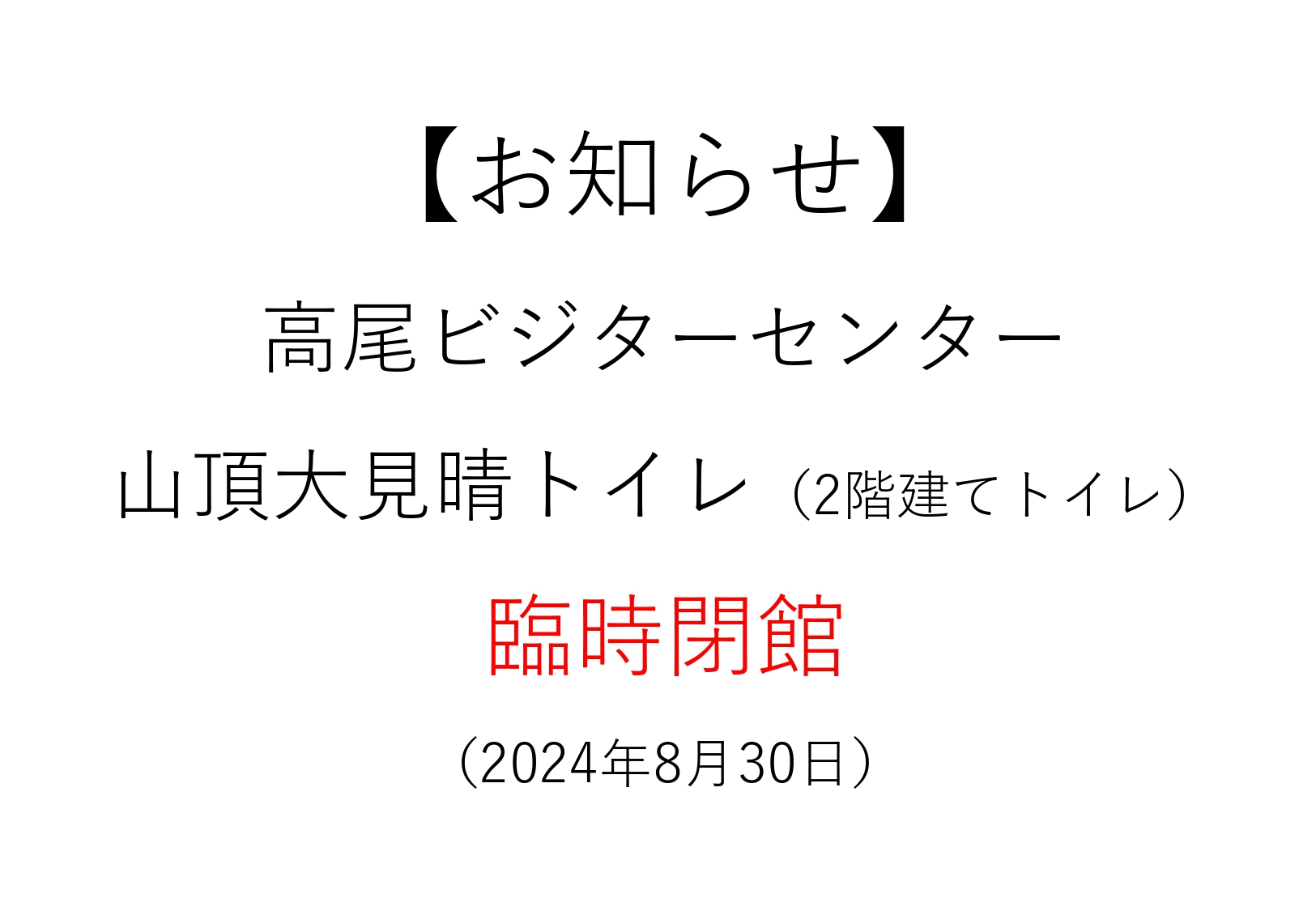 また、山頂大見晴トイレ(2階建てトイレ)も終日閉鎖となりますので、ご注意ください。