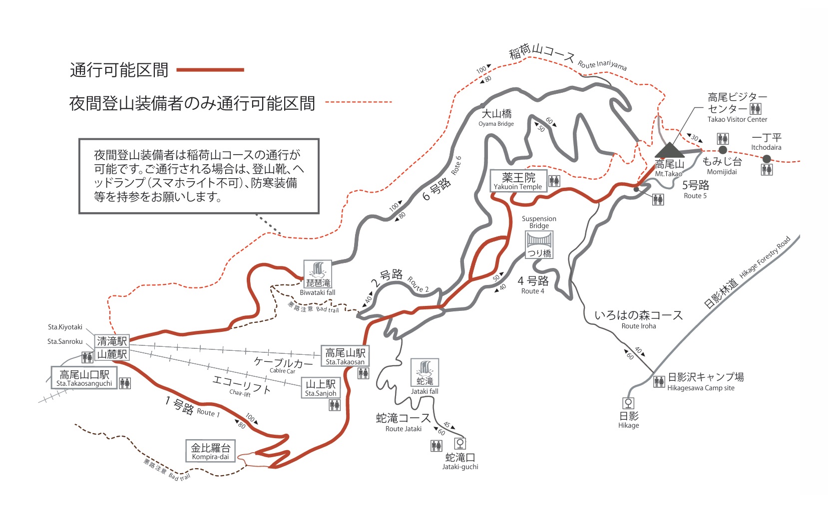 通行可能区間:1号路・6号路一部区間(清滝駅〜妙音橋〜琵琶滝)