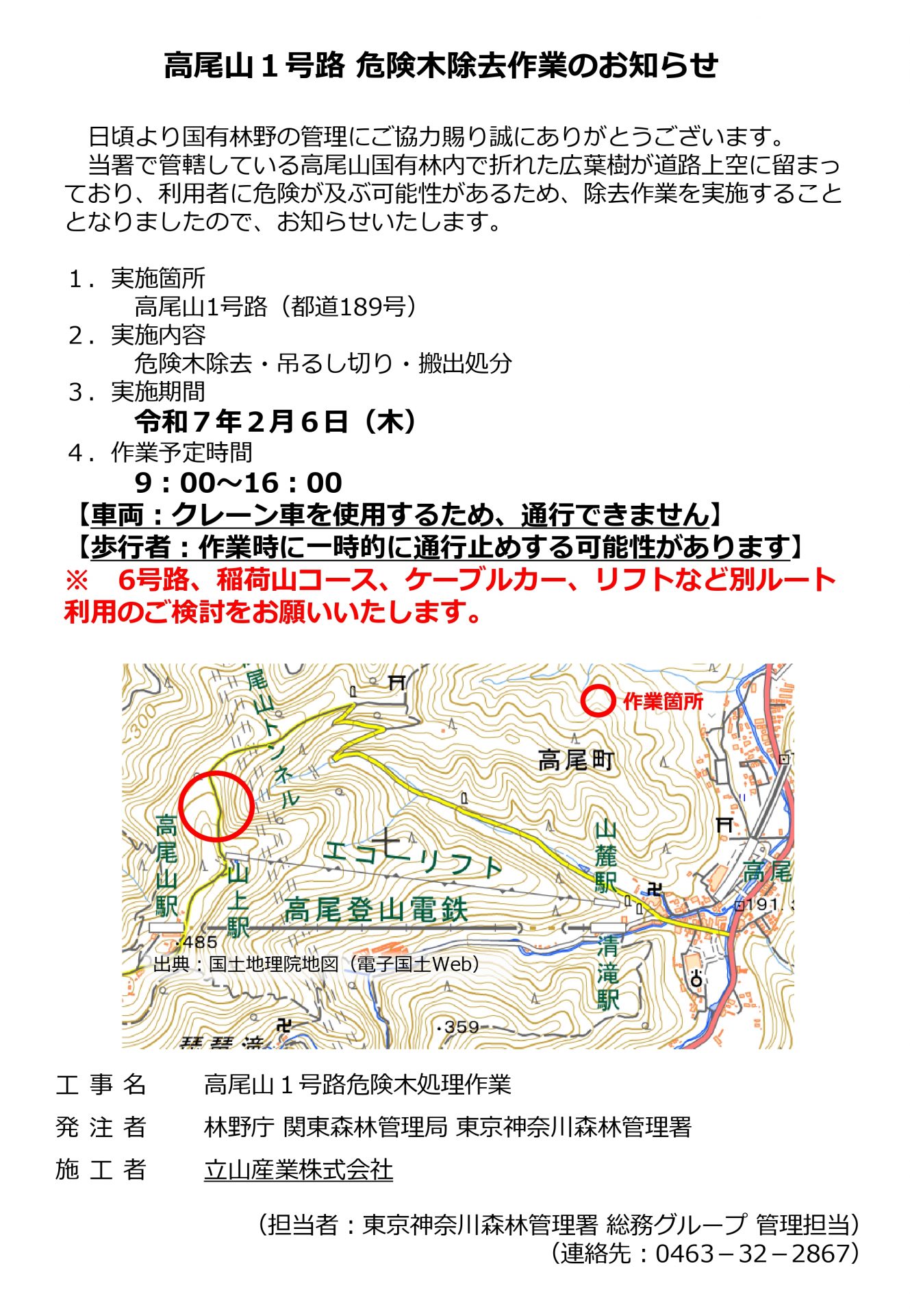 1号路の登山道の一部において、下記日程で危険木除去作業を実施いたします。