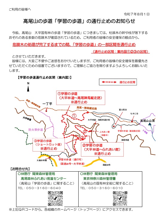 安全確保の観点から、危険木の処理が完了するまでの間、「学習の歩道」一部区間が通行止めとなります。