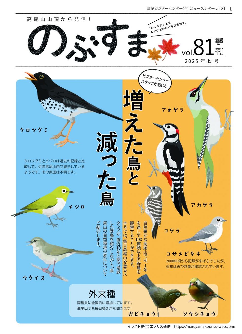2025年10月1日 ニュースレターのぶすま最新号(vol.81号)を掲載しました。 ニュースレターのぶすま2025年秋号vol.81を掲載しました! 今回は「高尾山で増えた野鳥・減った野鳥」特集です。 閲覧はこちらから。