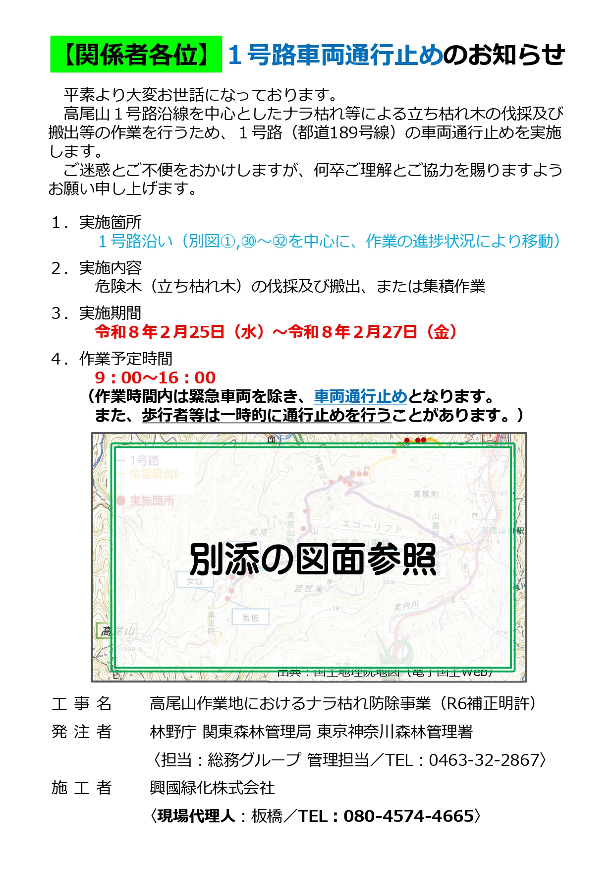 高尾山1号路沿線を中心としたナラ枯れ等による立ち枯れ木の伐採及び搬出等の作業を行うため、1号路の車両通行止めが実施されます。