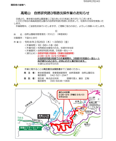 枯損木の伐採に伴い、下記の通り自然研究路3号路と5号路の一部ルートが通行止めになります。