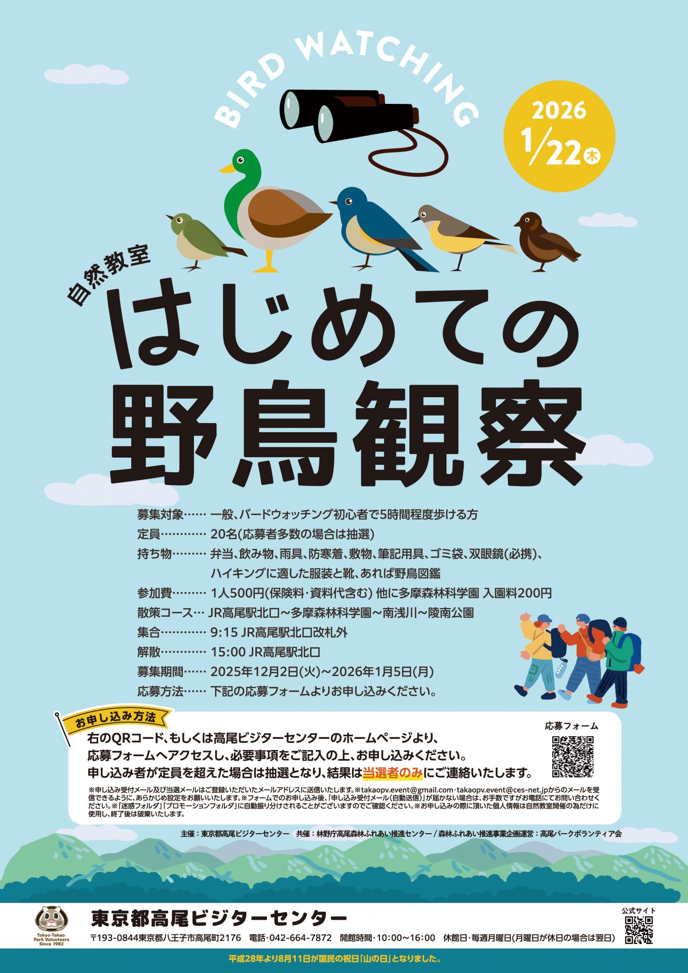 持ち物:弁当、飲み物、雨具、防寒着、敷物、筆記用具、ゴミ袋、双眼鏡(必携)、ハイキングに適した服装と靴、あれば野鳥図鑑
