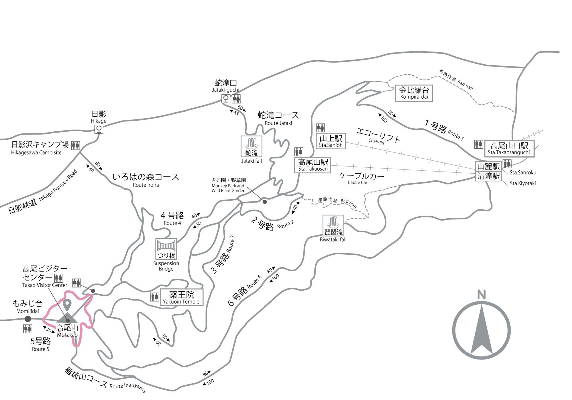 5号路 5号路(山頂を囲む周遊路コース) 山頂を一周するなだらかなループコース。生きものとの出会いが豊富で、少し時間がある方にオススメです。 全長:0.9㎞ 1周の標準タイム:30分 展望:あまり見えない 林の様子:人工林(江川杉)・落葉広葉樹など 道幅:狭い 道の状況:平坦な登山道 / 一部木道と舗装道 階段:なし 休める広場:奥高尾へ向かう道との交点にベンチが3つ程 登山者:少ない ①山頂直下の1号路両脇から道が続く ここでは右奥の道へ入る ②4号路側(北側)の平坦な山道を進む ③右手には「江川杉」が立ち並ぶ ④右に曲がれば、奥高尾方面へ進む道へ 5号路は左奥 ⑤平坦で狭い山道を進む ⑥稲荷山コースとの交点 ⑦6号路・3号路の入り口を横切る ⑧2階建トイレ(大見晴トイレ)が見え、スタート地点へ戻る